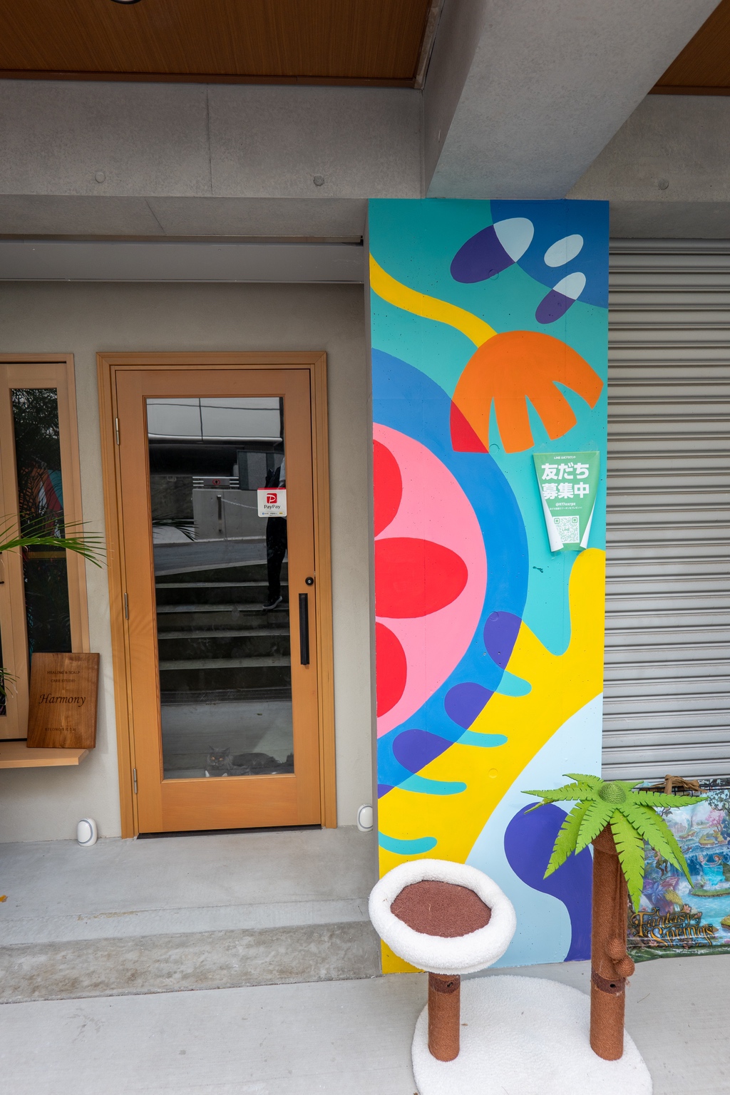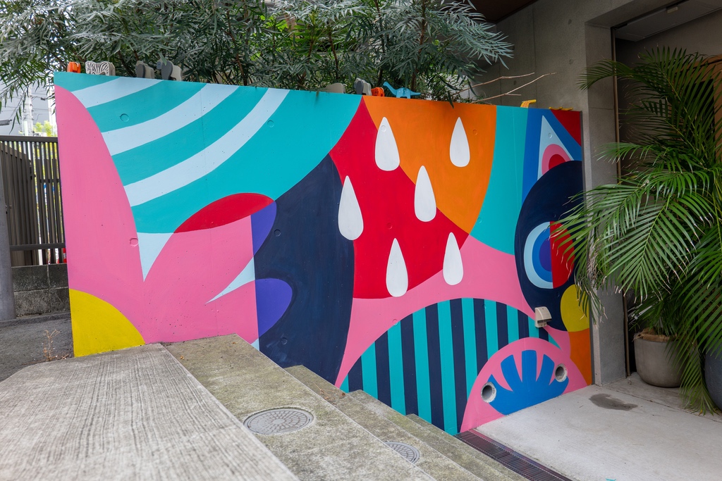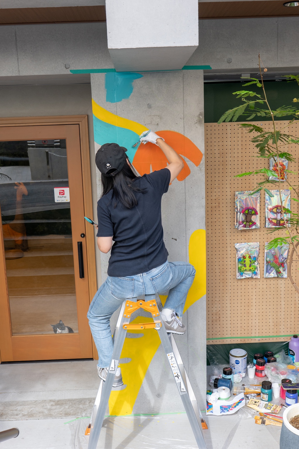 屋外の階段という無機質な場所に、ピンク、シアン、イエロー、オレンジといった多幸感あふれる配色を施しました。 一見派手に見える色使いですが、猫の温もりやカフェの賑やかさを象徴しています。通りを歩く人々にとっても、この壁画が新しい**フォトスポット(映えスポット)**や、街のアイコンとして親しまれることを願っています。
