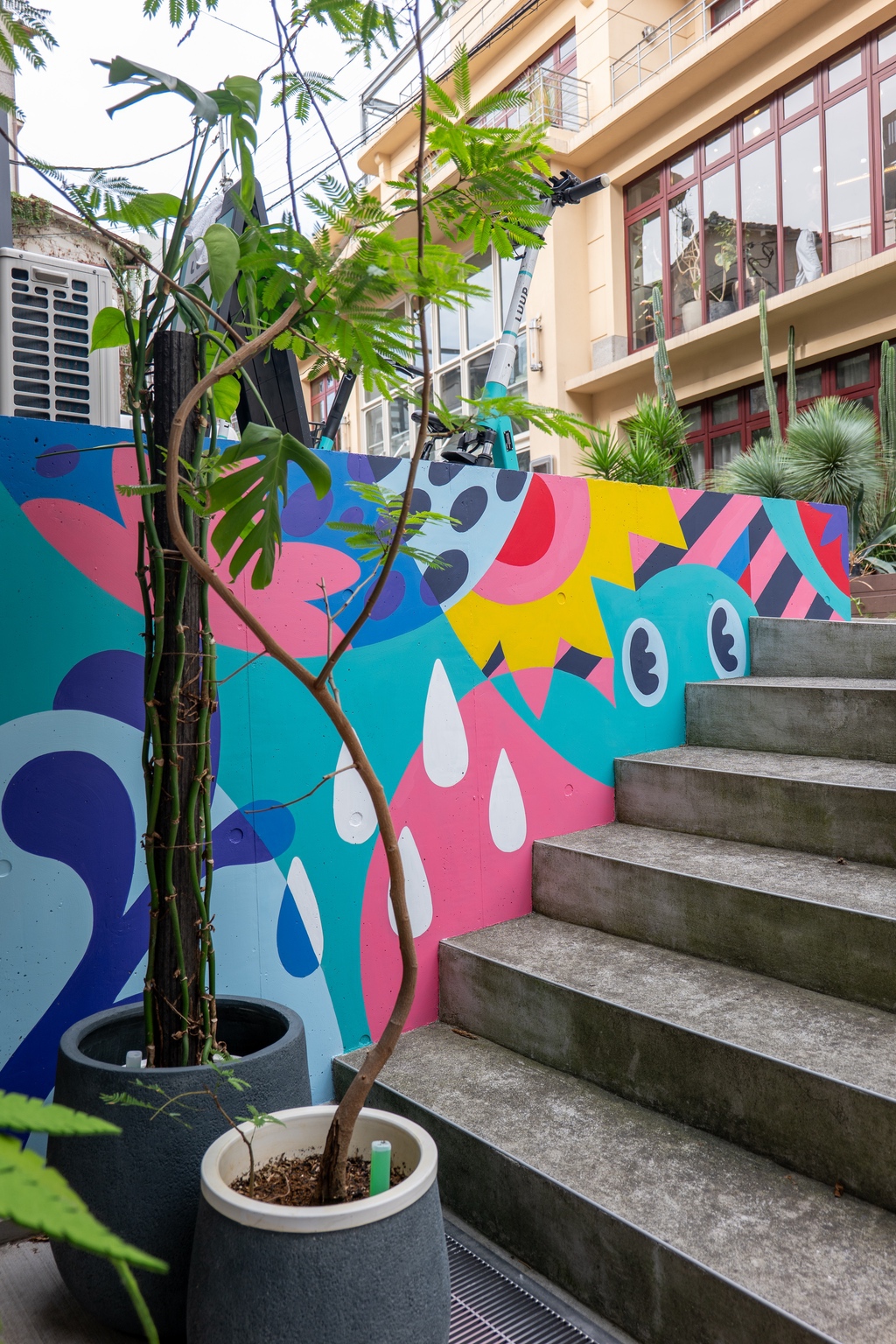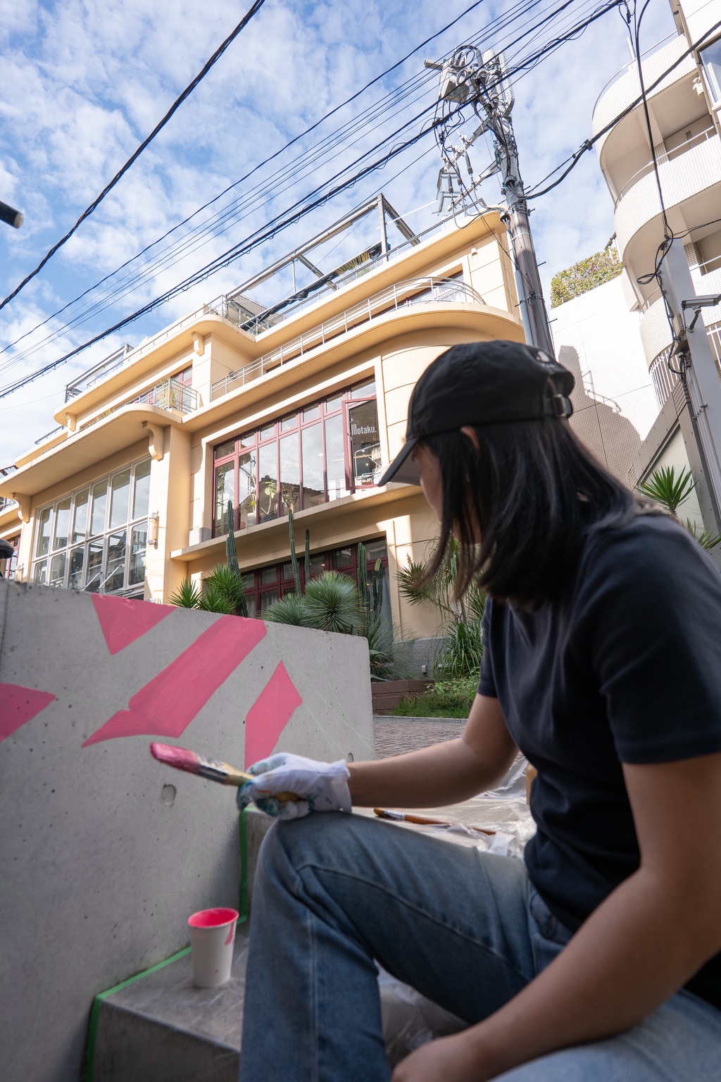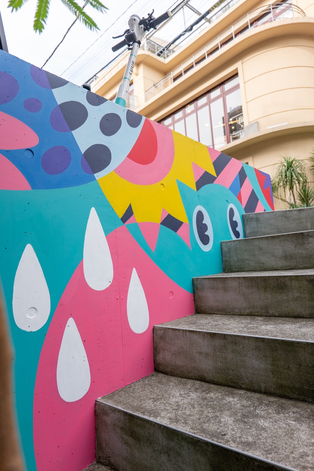 屋外の階段という無機質な場所に、ピンク、シアン、イエロー、オレンジといった多幸感あふれる配色を施しました。 一見派手に見える色使いですが、猫の温もりやカフェの賑やかさを象徴しています。通りを歩く人々にとっても、この壁画が新しい**フォトスポット(映えスポット)**や、街のアイコンとして親しまれることを願っています。