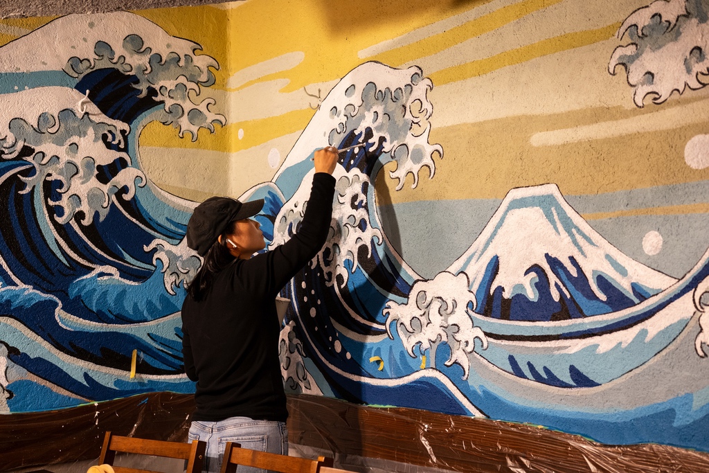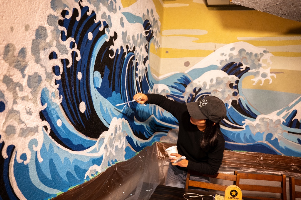 単なる模写ではなく、現代的なカラーパレットと力強いタッチを融合した手描き壁画として表現。伝統とモダンが共存する、今の時代に響く新しい「波」を描いています。