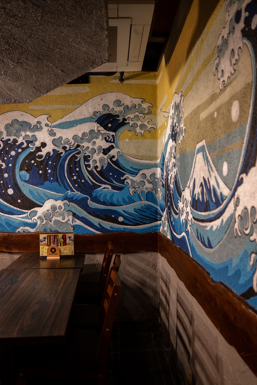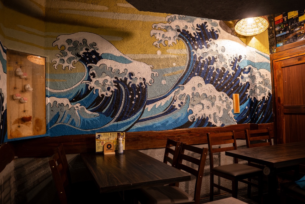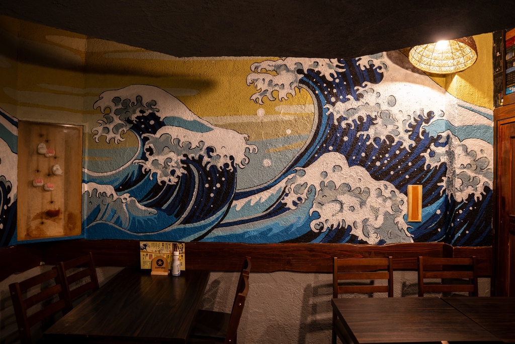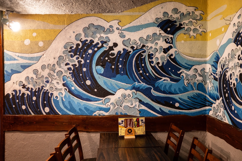 店名にちなみ、テーマは「海」。葛飾北斎の傑作『神奈川沖浪裏』をモチーフに、日本の伝統美術を現代の壁画アートとして再構築しました。